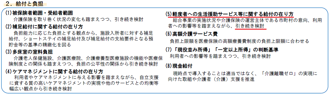 6.給付と負担:軽度者への生活援助サービスを総合支援事業へ移行は見送り